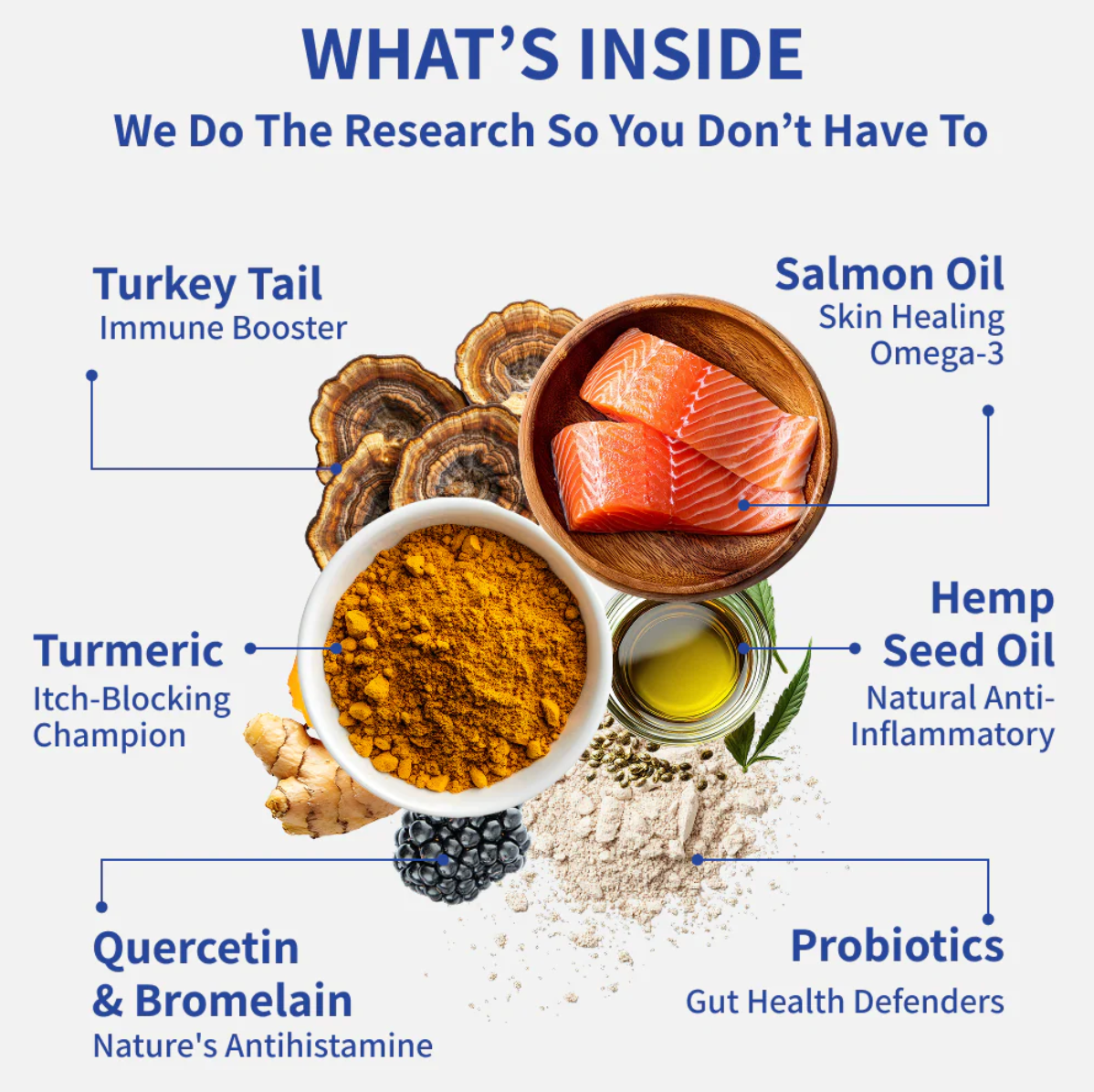 Made with all-natural ingredients, supports healthy skin, reduces scratching, and keeps your pup comfortable, without harsh meds or endless vet visits.