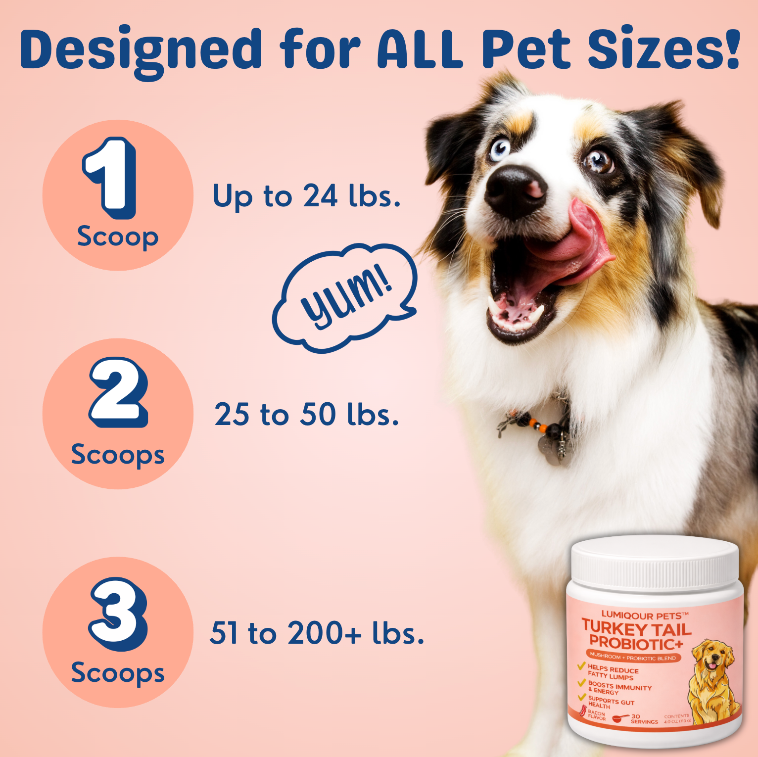 We keep it simple and effective — each scoop delivers 1000 mg of Organic Turkey Tail Mushroom Powder to help fight infection and shrink fatty lumps, paired with Lactobacillus Acidophilus, a powerful probiotic that promotes gut health and strengthens their immune system.